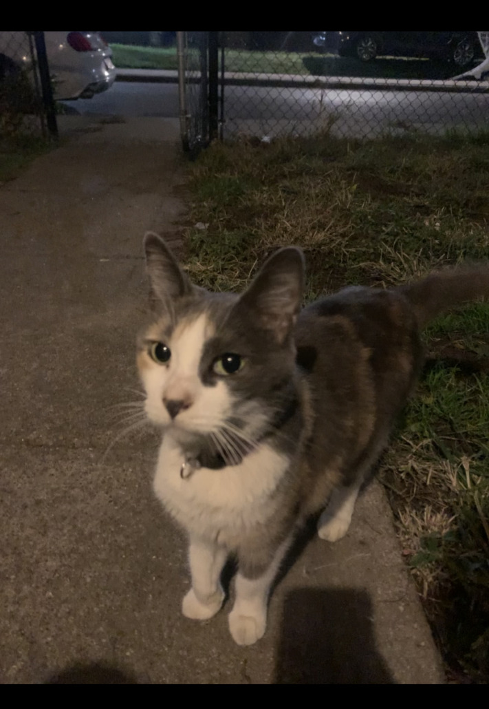 Extremely friendly, has a purple-ish collar on, is a female, not friendly with dogs though, looks like she may have had a recent litter