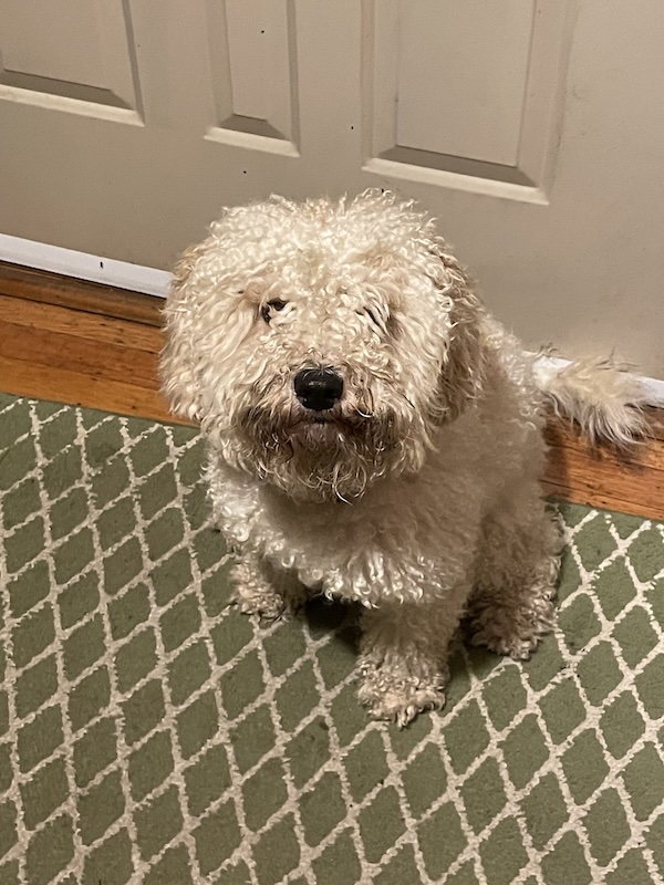 Lost white poodle mix. It is obvious someone loves this dog. Please, help me find its owner.