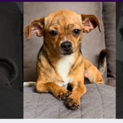 Small black and Brown brindle Chihuahua, she was wearing a white bow tie with watermelons on it