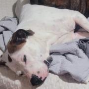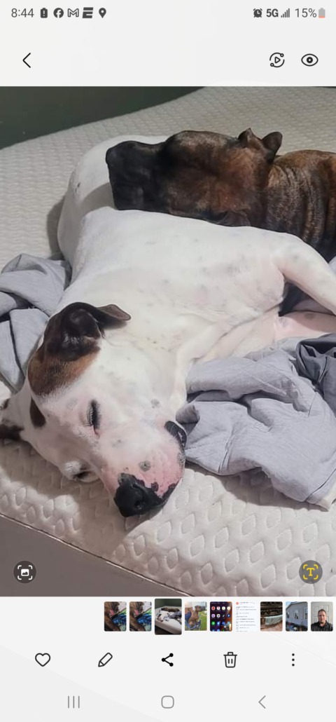 Super friendly large white female dog with little black spots all over u can only see up close. Very sweet and lovable. 7 or 8 years old i cant remember but she is fixed as well. She is the mother of 3 of my orher dogs. Please bring momma home