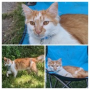 Orange and white neutered male, long hair, one black spot on hip. Last seen with a black collar.