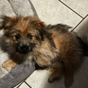 He answers to Fluffy or Prince, he is about 5 months and weighs less than 5lbs. He is mostly brown with black fur sticking up from his backsides. And a fluffy tail that curls up. His hair is just like his name, fluffy and poofy. He is hyper and very friendly.