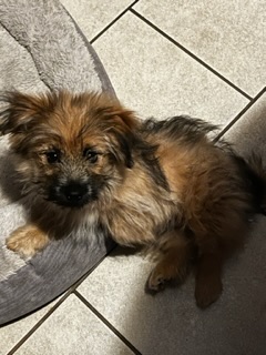 He answers to Fluffy or Prince, he is about 5 months and weighs less than 5lbs. He is mostly brown with black fur sticking up from his backsides. And a fluffy tail that curls up. His hair is just like his name, fluffy and poofy. He is hyper and very friendly.
