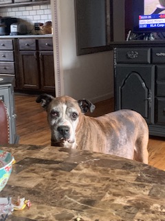 Brindle boxer, 10 years old, losing some hair, eye is currently red, bit of a chunkier dog.