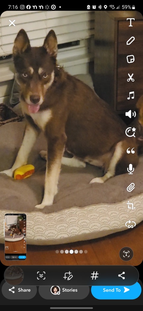Brown female, husky mix. Blue eyes. A lot of energy. Please provide proof of ownership.
