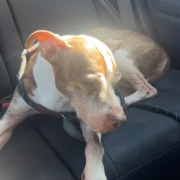 Old female pit mix. White and tan. Large mass on side of body. Currently at Indy humane