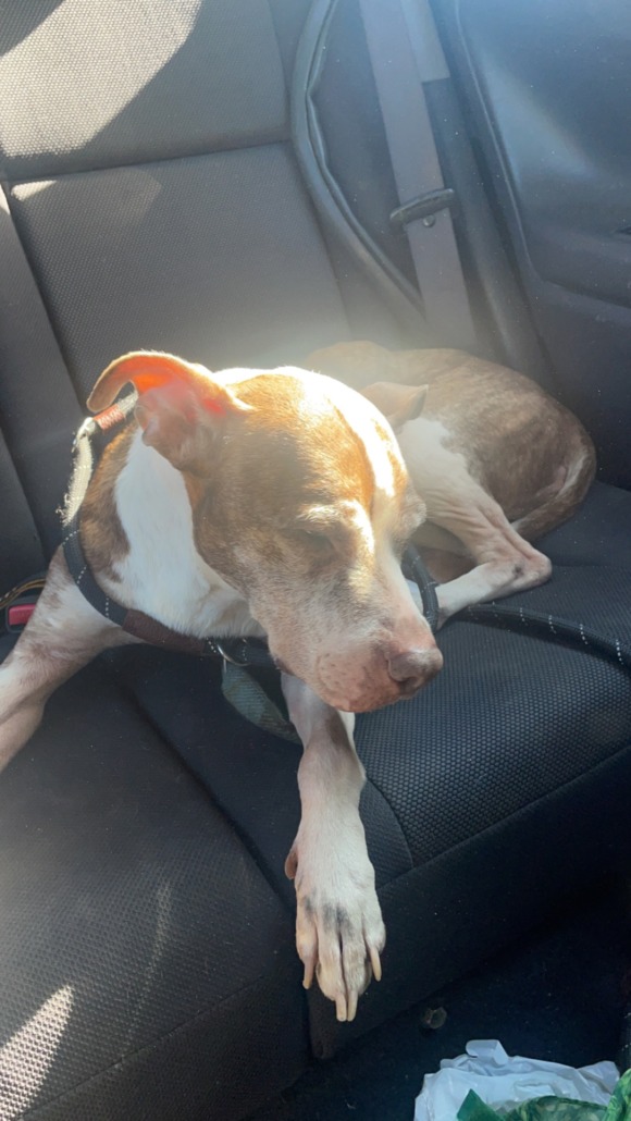 Old female pit mix. White and tan. Large mass on side of body. Currently at Indy humane
