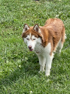 Brown/red fur with white, and blue eyes. Female husky.