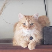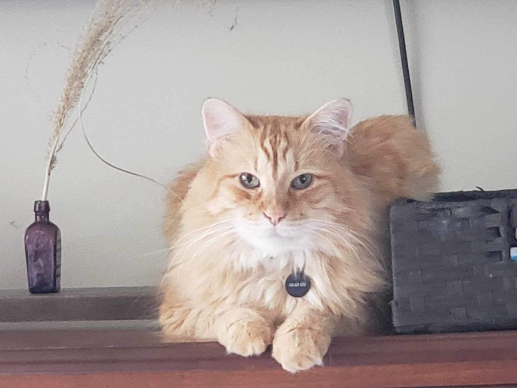 Zinger is a big, fluffy orange tabby. He is very friendly and can be talkative. He has a collar with a tag with his name and my phone number on it.