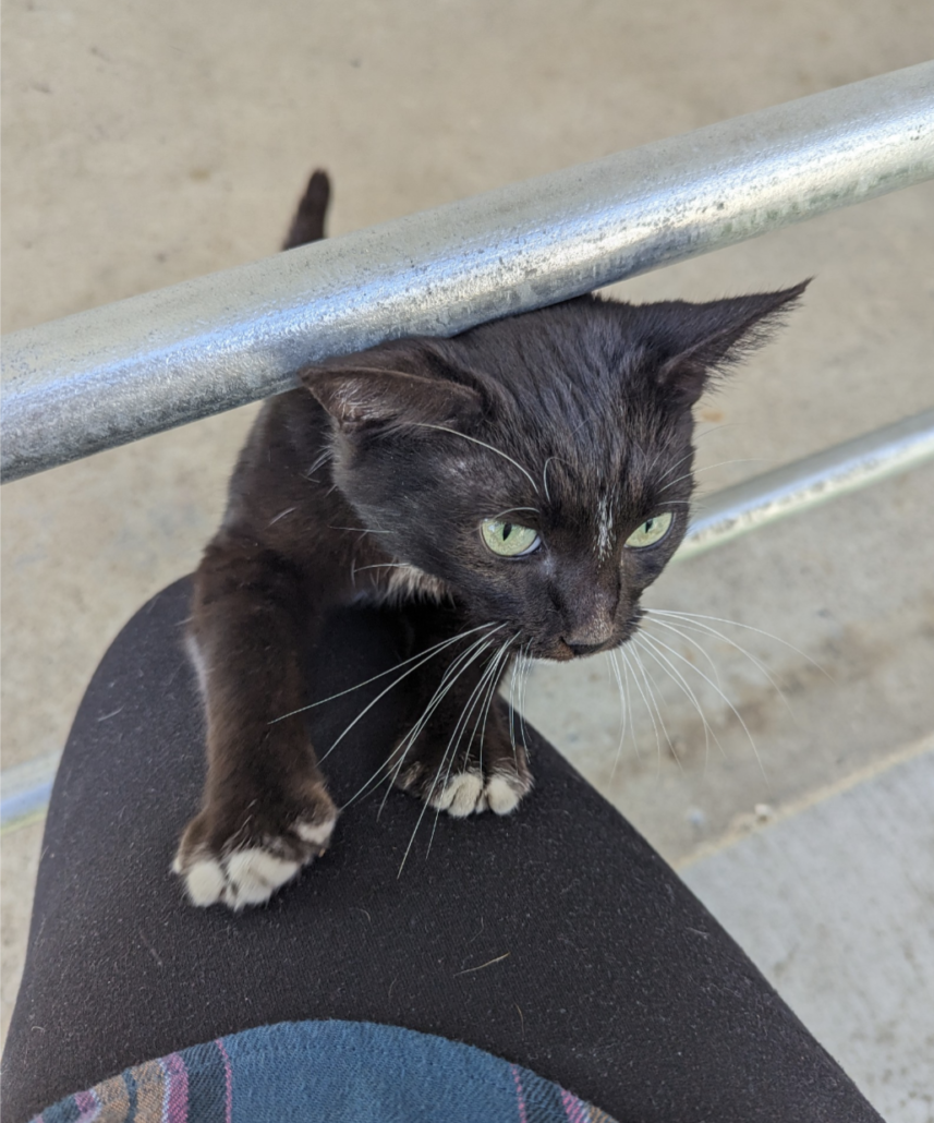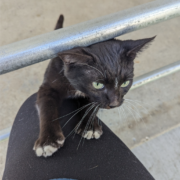 Very friendly, social young cat. No chip. Short tail, black with white front paws. Porch surfing Dawson Street.