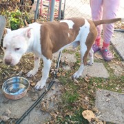 Found near 10th Street and Gibson running in traffic and trying to enter Shell gas station. He is white with brown spots. Appears to be Pitbull mix. Unaltered. Has injuries on his right rear leg and an old scar on the top of his head. We have not had him scanned for a microchip.
