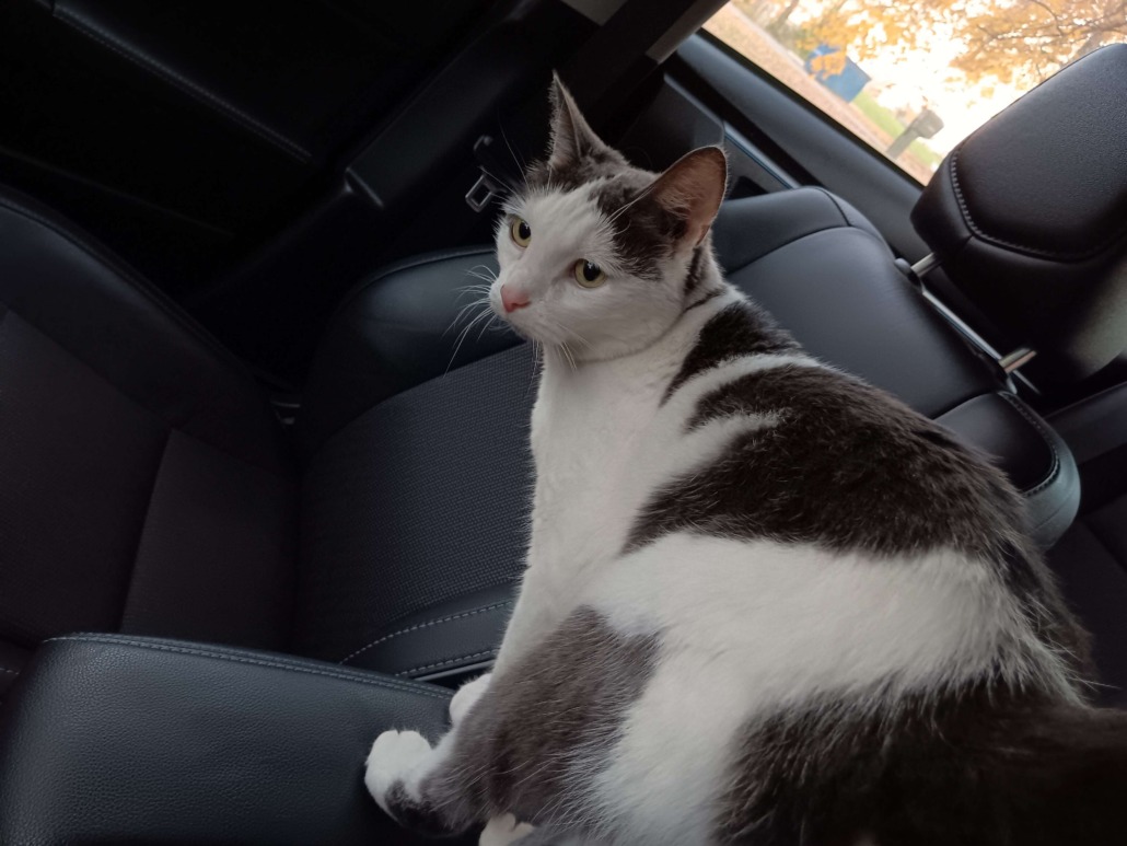 Proof of ownership required! She is a sweet white cat with gray spots and green eyes. She’s small, and likely under a year old.