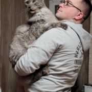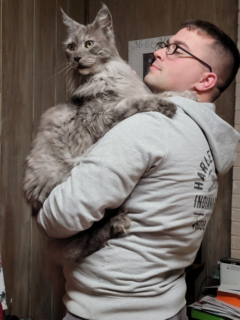 His name is Akuma he is a Maine coon cat. He is 8 years old and missing a bunch of teeth. He is mostly grey and kinda grumpy.