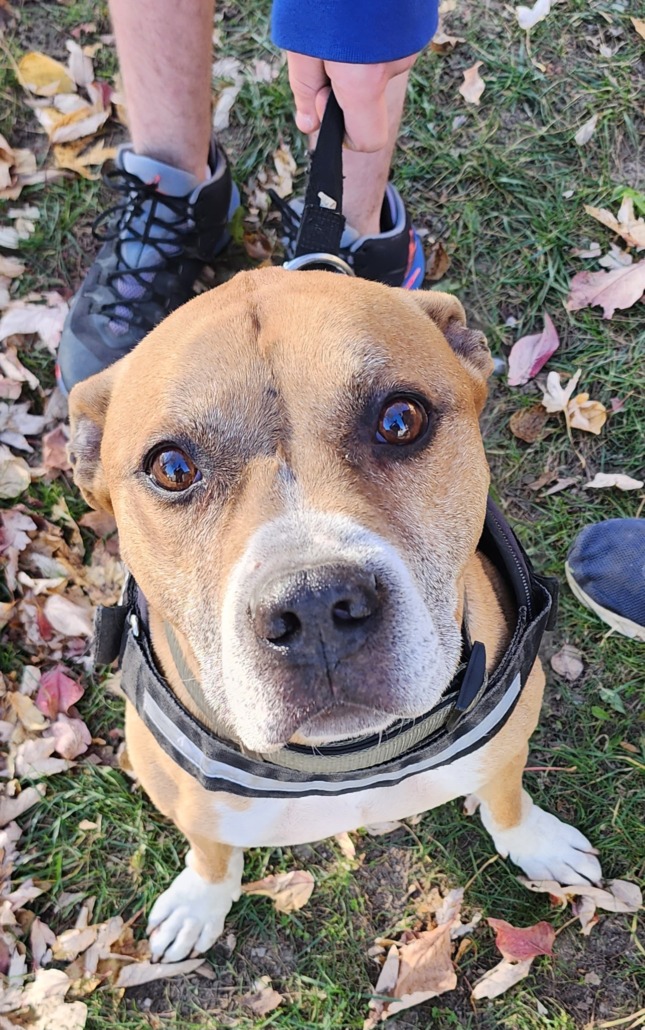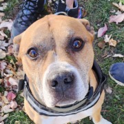 Brown Pitbull Male with a julius k9 harness and green kong collar. Found near Banta and Bluff. Proof of ownership is required.