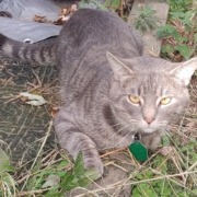 Gray intact tabby wearing collar with an Apple air tag and rabies tag.