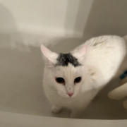 White cat with small grey patch on forehead with green eyes. Wondering around River Ridge Dr. in Keystone. Friendly, is okay with being held and is playful. Litter box trained, nails seem to have been trimmed about a week prior. Staying with me until further notice.
