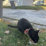 This cat is hanging in the alleyway behind my friends house and seems hungry. It has a red floral bandana and a bell but no name tag.