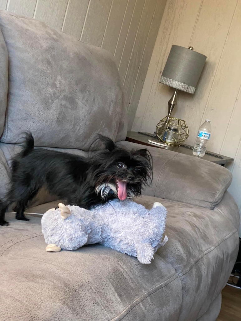 Black, white fur on tummy, 3lbs, Short tail, brown fur around mouth/nose