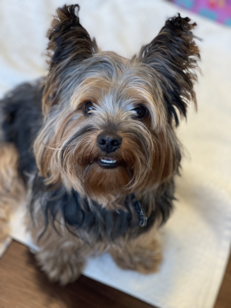 3 year old black, grey and tan Yorkshire Terrier. Had on black harness. Is microchipped.