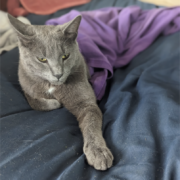Bebe, Female gray cat. Has a bend in her tail and limps from her hind R leg previous injury.