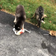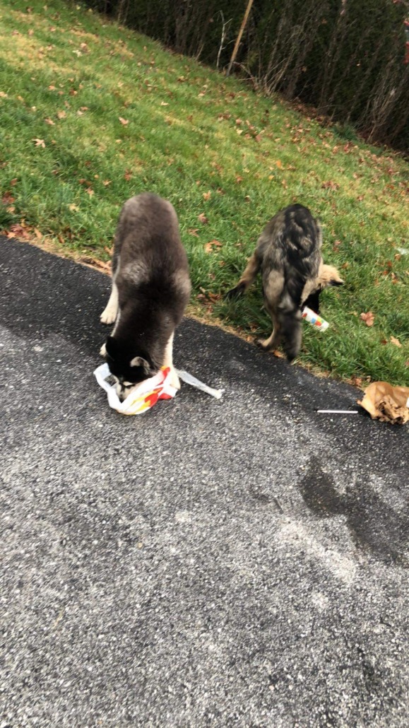 Husky and German Shepherd, both appear to be in healthy, well-groomed condition from safe distance. We could not approach because they were eating fast food and we had our dog with us. Found in the back guest parking lot of Valley Forge Apartments, that runs along the south side of the apts. They are unfamiliar to us and not believed to live here.