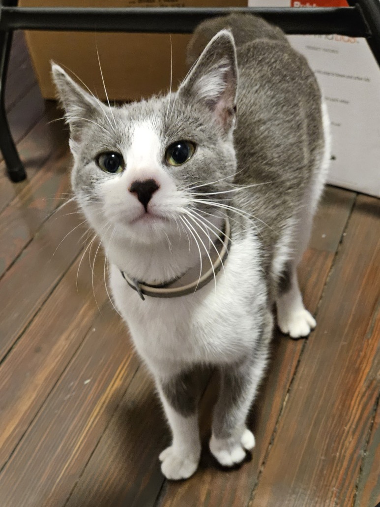 Mostly gray and white cat, young cat, not microchipped