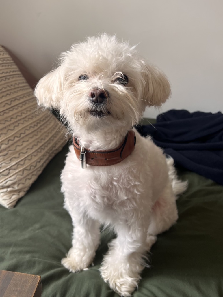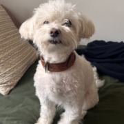 Duke is a white Maltese Poodle with short hair. He is a small dog, around 8 lbs. He was last seen wearing a brown collar with an AirTag and a red paw print tag containing his name and my phone number.