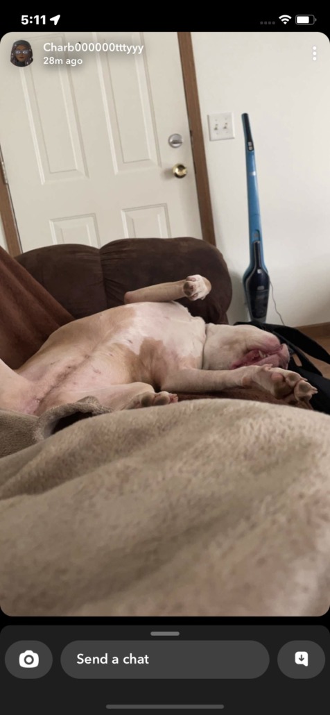 Medium sized American Bully/Pitbull mix with pink, spotted nose.