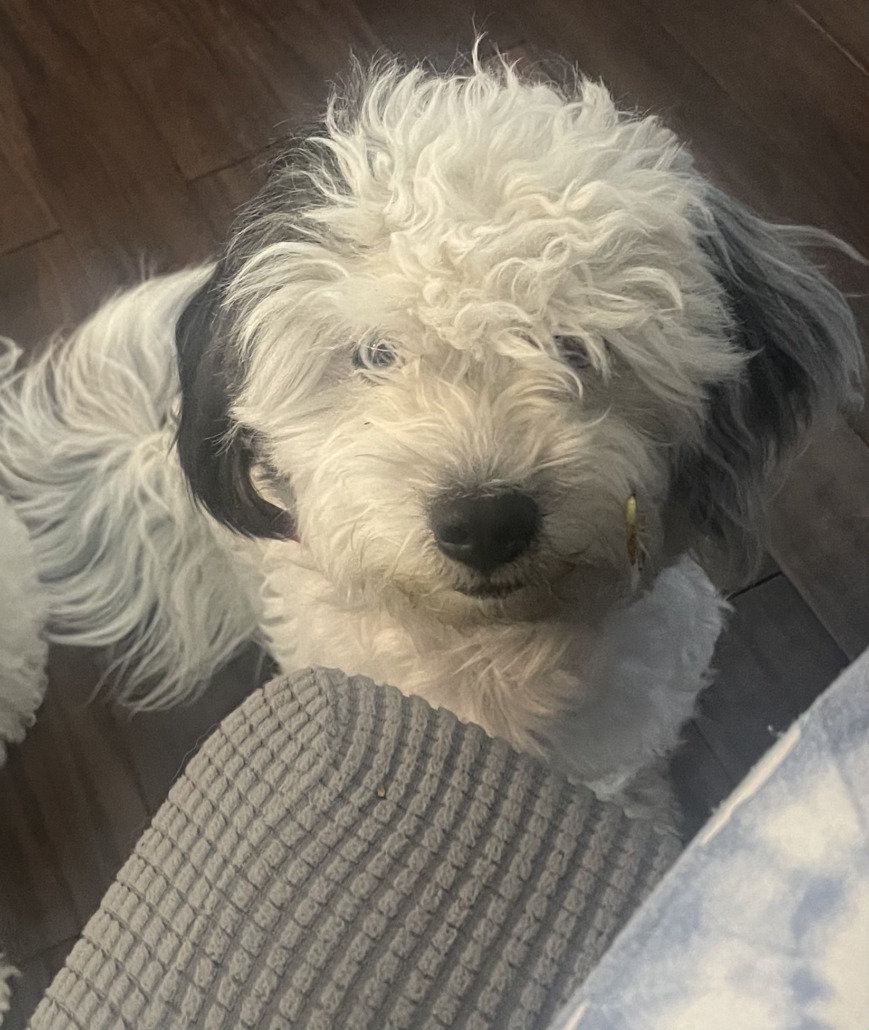 Small-medium white sight black spots and ears female dog. Has blue eyes and a collar. Friendly.