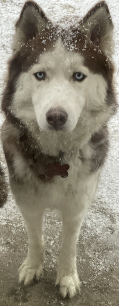 Female husky with brown/red and white fur. Has blue eyes and is friendly but skittish. No collar.