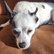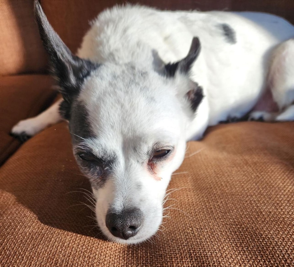 Sweet older dog. Mostly white with black spots.