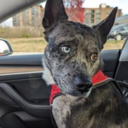 Sweet grey and black spotted dog with heterochromia, red harness and red collar. No tags. Proof of ownership required.
