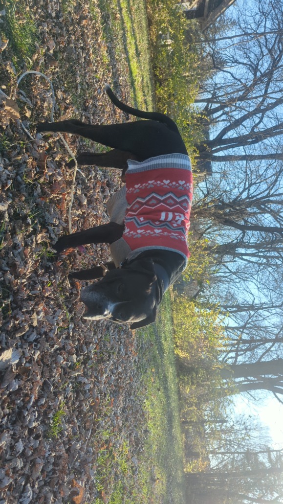 Wearing Christmas sweater and black collar. Black bully breed with some white markings