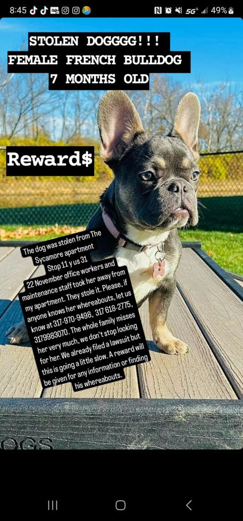 November 22 The dog was stolen from The sycamore apartment. The office workers and maintenance people took her from my apartment. They stole her. Please, if anyone knows her whereabouts, let them know at 317-970-9498, 3179983070. The whole family misses her so much, we don’t stop looking for her. We already filed a lawsuit but this is going a little slowly. I just want this item to be 7 months old. A reward will be given for any information or finding its whereabouts.