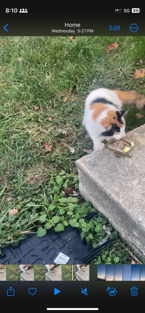 small, friendly , meows a lot , very sweet, been here for a week or two, has green eyes and calico, has a reddish collar with a bell, currently living on side of house outside.