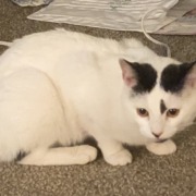White male NOT NEUTERED cat: about 12lbs, white with black spots on forehead/ears, chin, left eyebrow, back of legs, right foot/ankle, two on left side/back