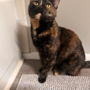 Tortoiseshell cat. No collar. Clipped left ear. Microchipped