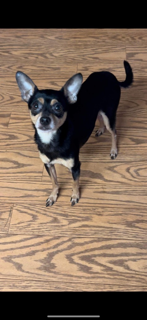 Chihuahua / Miniature Pincher mix. He’s a foster that I’ve only had a day and he’s dissapeared. He’s wearing a tag for ARPO, Alliance for Responsible Pet Ownership.