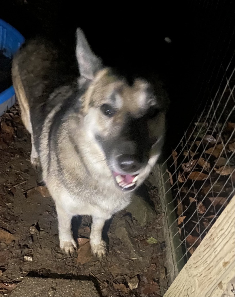 German Shepherd. I believe a female but too timid to let me check. Safe and warm and fed for the night but very scared and wants their family.