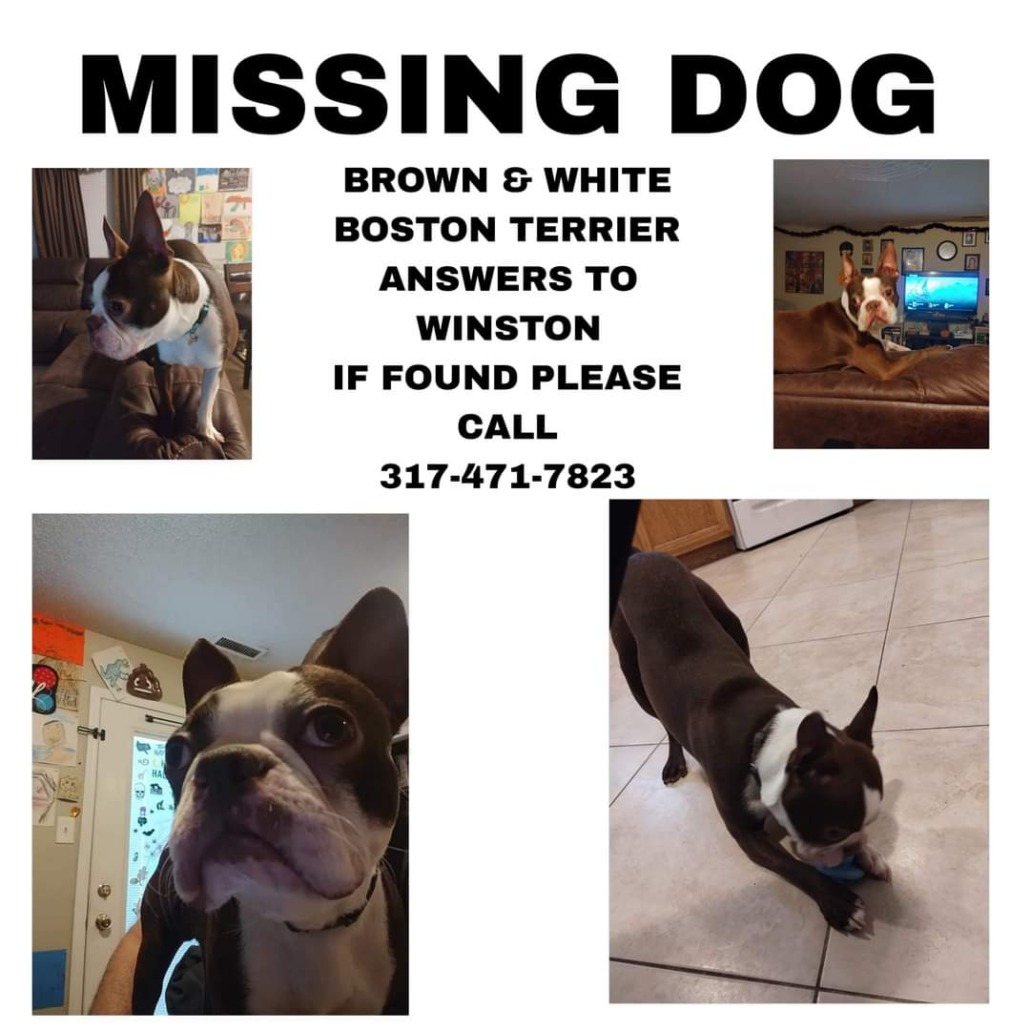 Brown and white Boston terrier, left paw is white, answers to Winston. Please help us bring our missing family member home. He is greatly loved and missed very much