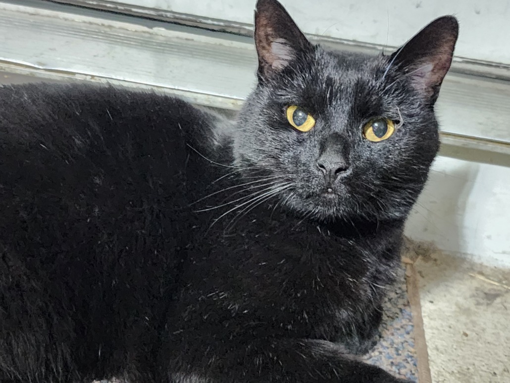All black male cat, no identifying marks. Yellow eyes. Friendly.