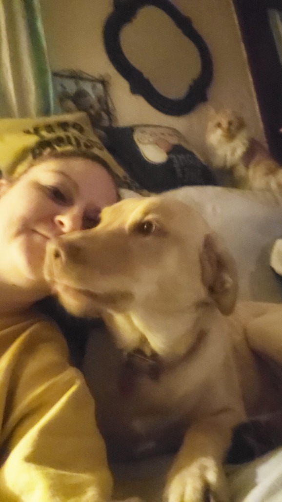 Yellow lab with a pink collar with a tag with her name Samus on it. Friendly still a puppy. 1 year and 3 months old
