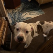 White and brown spotted Pit. Not sure of his age but fairly young. Very submissive. He is an intact male. Need proof of ownership.