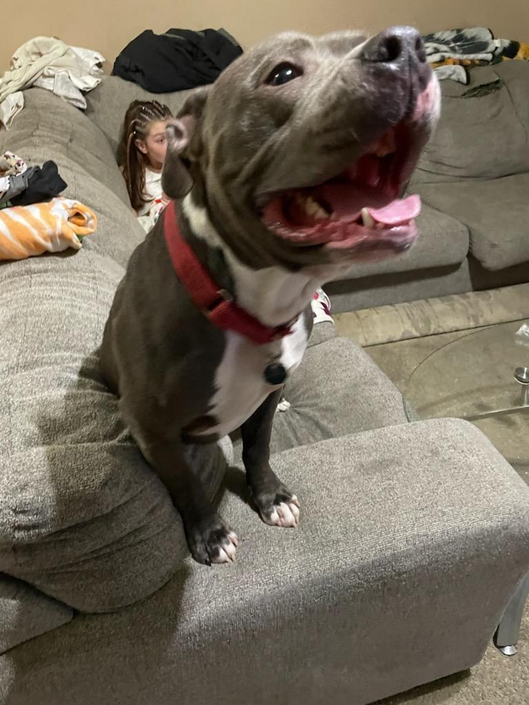 Grey and white blue nose pit wearing a red collar with two tags on it . And he is neutered.