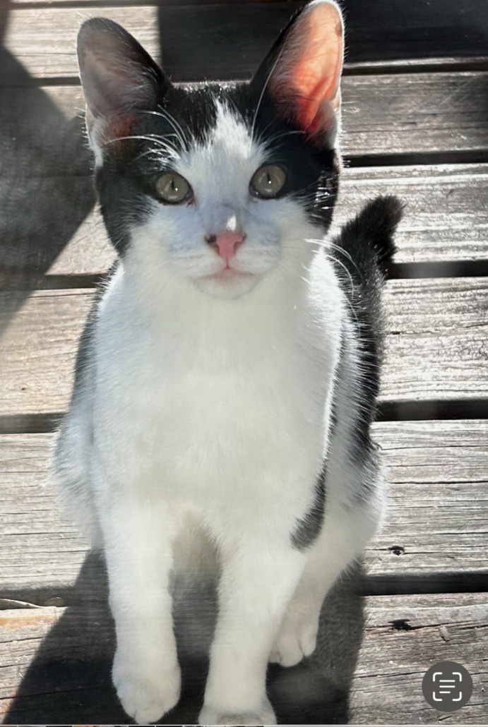 Black and white young male cat. Unaltered. Has a black spot on his pink nose. Tail is all black.