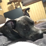 Young, dark gray, male Pitbull -extremely affectionate, visits regularly to play with my dog and the neighbors dogs. He showed up yesterday injured. We’ve cleaned the wounds and allowed him to come inside. He’s eating, drinking and playing