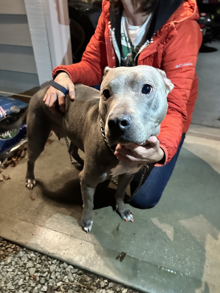 Sweet large gray pit bull female with painted nails!! She was dragging a heavy chain with slip choker near 12th and Massachusetts
