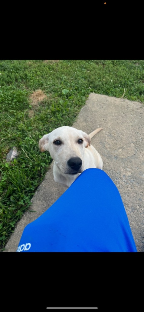 1 year old female lab mix. Wearing a red collar.