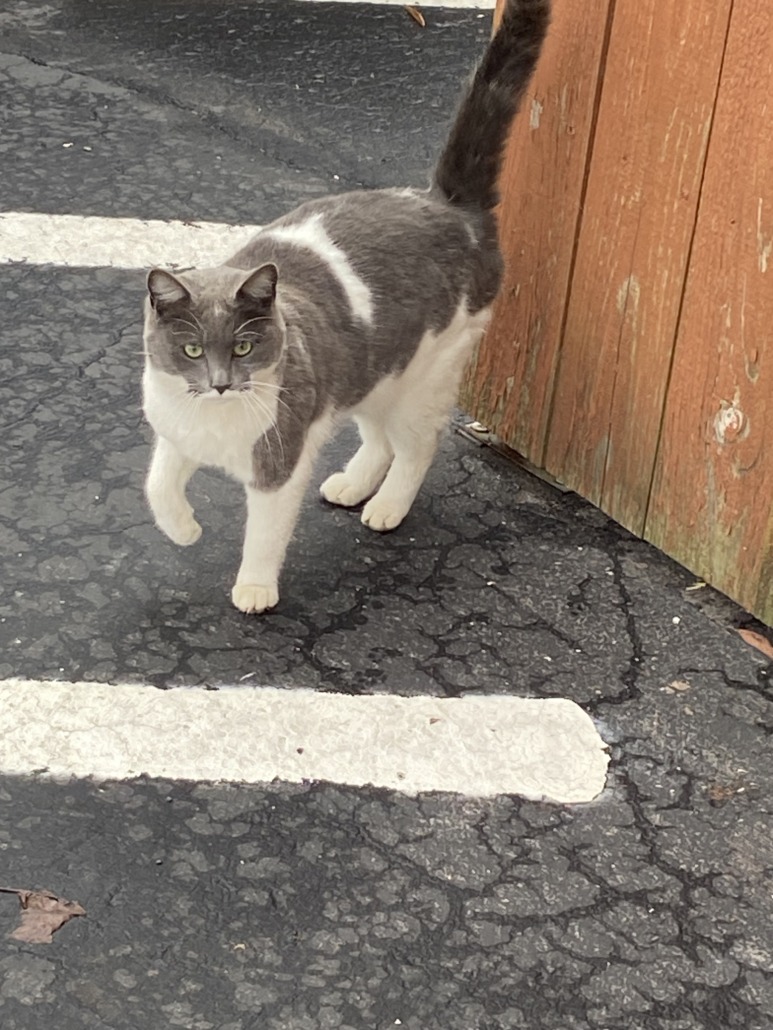 Gray and white kitty is at Jimmy’s Diner at 3301 Shelby Street. Kitty is friendly and asking for help but the proprietors say no one has been able to catch it.