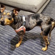 Kaia is a 1.5 to 2 year old female. Vet’s best guess of breed is Catahoula Mix. But only 30 to 35 lbs. A type of tri-color. Black base with blue roan or meryl (grey bloching over the black) and reddish tan face and leg markings. No real white on chest. Amber eyes. Black toenails. Ears are erect except for drooping of the tips. Dark coloring of inner ear. Still quite thin about the ribs and back to the touch. A new formal very recent rescue adoption. Timid vs agressive. IS microchiped! She has been through so much and just began her transition to a loving forever home full of patience, a big fenced yard with room to run and play, hikes and frisbee and sister dogs to play with which she loves. Please reach out even if you just see her. She may come to treats or friendly dogs with patience. Thank you so much!